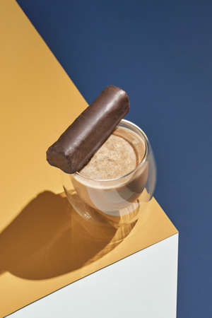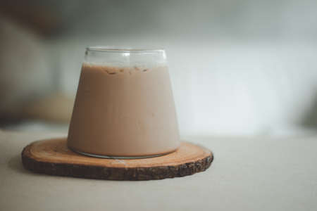 Chocolate Milkshake with chocolate cereals, cheese, and Choco chips in the big clear glass cup. Selective focus close-up on top of it and blurry background.