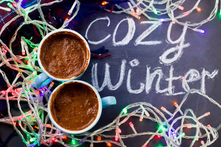 Closeup of hot cocoa drink in blue mug on dark wooden table.