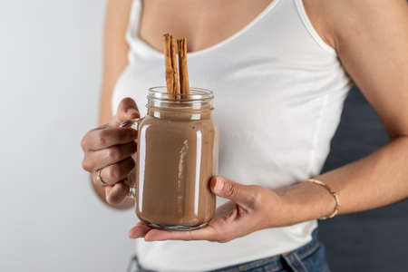 A woman holds in her hands a jar filled with fragrant natural cocoa powder, which she takes out with a teaspoon. The process of making a delicious invigorating pleasant drink for breakfast.