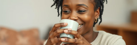 Woman enjoys a warm beverage at home, smiling and savoring the moment in a cozy atmosphere