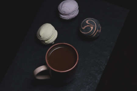 Morning breakfast of coffee and sweet marshmallows and tiramisu on dark background.