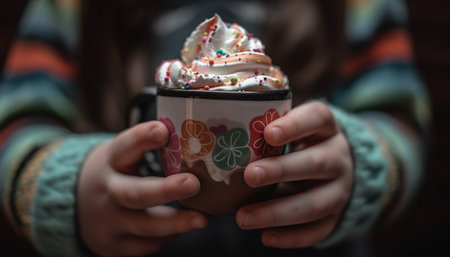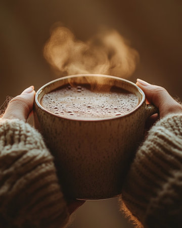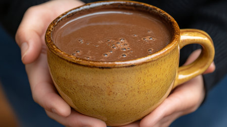 Hands Embracing the Warmth of a Ceramic Mug Full of Hot Chocolate on a Cozy Winter Day