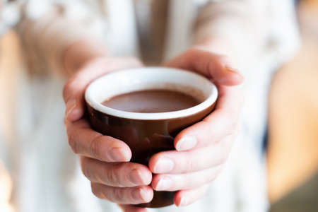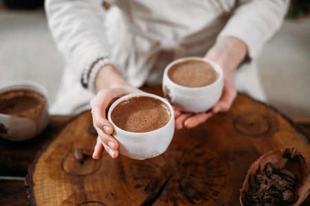 Hot handmade ceremonial cacao in white cup. Woman hands holding craft cocoa, top view on wooden table. Organic healthy chocolate drink prepared from beans, no sugar. Giving cup on ceremony, cozy cafe