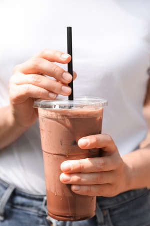 Woman holding takeaway plastic cup with cold coffee drink outdoors, closeup