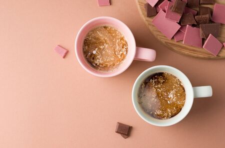 two cups of coffee with milk on a brown background next to chocolate. copy space