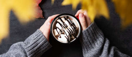 hands holding a cup of hot chocolate with marshmallow on a dark gray background. Autumn concept of a warming drink. Top view. Horizontal orientation.