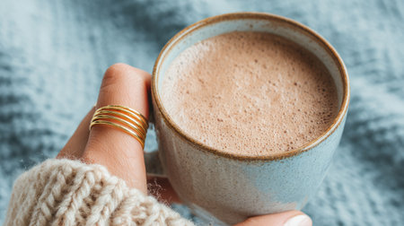 A serene and cozy winter moment featuring a hand holding a warm drink in a stylish cup, reminiscent of pure comfort and relaxation, set against a soft blue blanket.