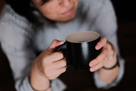 Cup of coffee in women's hands on black background. Woman warming her hands on mug of hot beverage in the dark. Copy space. Minimal style. Low key