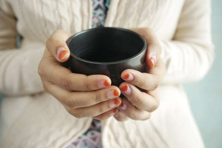 A woman with a brown manicure and a brown woolen jacket is holding a beige mug with hot fragrant coffee. A pleasant cozy breakfast with an invigorating fresh drink.