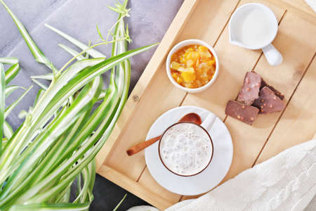 cozy morning breakfast. top view of coffee cup and sweets on a wooden tray on a sofa. knitted plaid on a gray bed. pleasant morning mood.