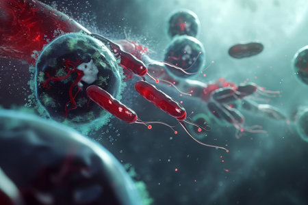 A blue and green bacterium is attacking a red cell in the human body, microscopic view, hyper-realistic illustration, high resolution, red background, high contrast, vibrant colors, detailed textures of cells, medical science style, detailed depiction of the attack on the top left corner of the picture. --ar 17:10 --v 6.1 Job ID: e3aed7a7-ff80-4b6c-a2b4-87de3dc13ed2