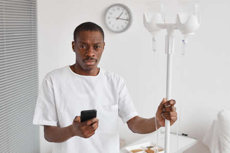Waist up portrait of African-American man holding onto iv drip stand during treatment in hospital and looking at camera, copy space