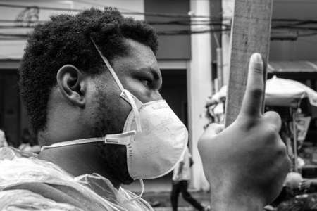 Salvador, Bahia, Brazil - July 24, 2021: People protest against the government of President Jair Bolsonaro in the city of Salvador. They use banners, posters, stickers and masks with slogans.