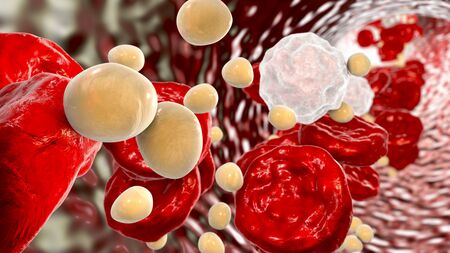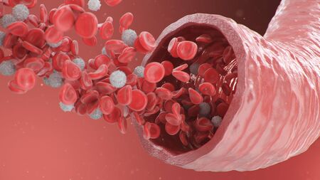 Red and white blood cells in blood vessels, 3d rendering. Computer digital drawing.