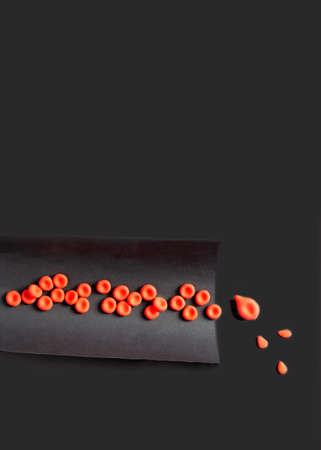 World hemophilia day concept. Red blood cells and blood drops are made of plasticine clay on a black background. copy space