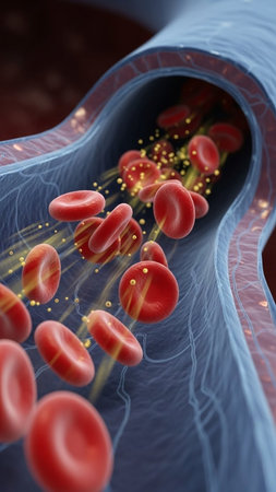 Close-up illustration of cholesterol deposits in blood vessels. Arterial plaque buildup depicted in vivid detail. Useful for medical training, health awareness, and scientific visualization.