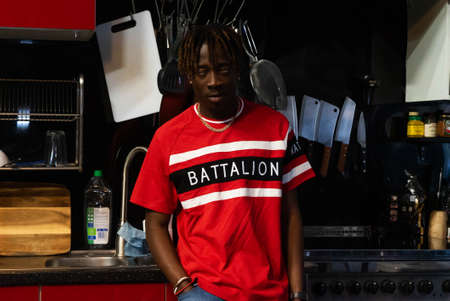 Intense close up view of a young adult male with a buzz cut hairstyle standing in harsh sunlight against a background of crumbling black paint and exposed red brick wall texture.