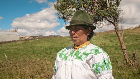 Cangahua, Cayambe / Ecuador - September 12 2023: Portrait of elderly indigenous woman from Cayambe walking through the field during the day