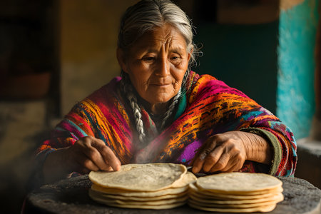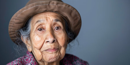 Close up portrait of an elderly indigenous woman wearing a vibrant orange straw hat and colorful embroidered clothing, reflecting wisdom, dignity, and resilience