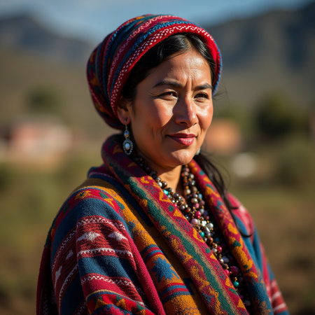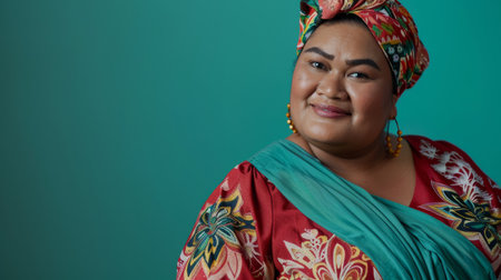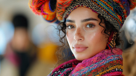 A captivating portrait showing a woman with dark braided hair adorned in traditional colorful clothing. The vibrant backdrop complements her animated expression, celebrating cultural heritage.