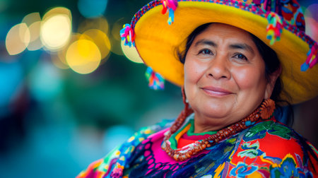 Vibrant Traditional Mexican Costume: Smiling Woman in Sombrero and Colorful Dress