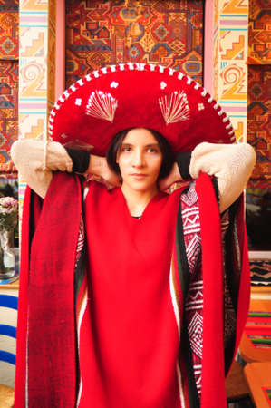 Beautiful Mexican woman smiling wearing Mexican Hat in the traditional dress