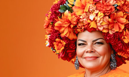 woman adorned vibrant floral headdress, showcasing Hispanic heritage through cultural celebration.
