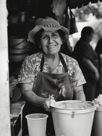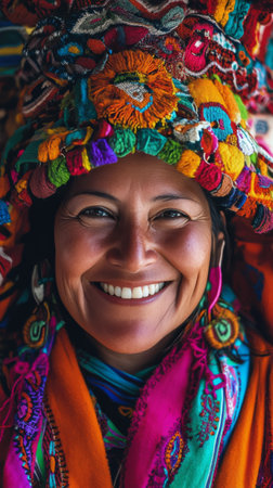 Portrait of a cheerful Mexican craftswoman wearing a vibrant, handcrafted hat, representing rich cultural heritage