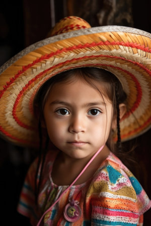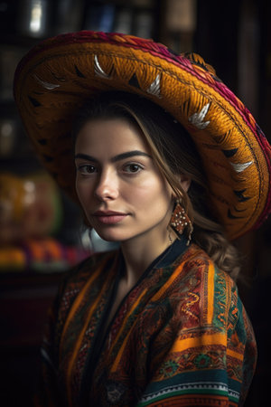 Young hispanic female in traditional colorful mexican attire and embroidered sombrero. That the image is generated using AI.