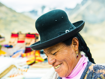 PERU - NOVEMBER 6, 2010: Unidentified Peruvian lady in the popular bowler hat walks the street in Peru, Nov 6, 2010. Over 50 per cent of people in Peru live below the the poverty line.