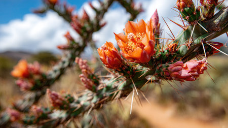Close-up image of a cactus plant with vibrant orange blossoms and numerous spines. The focus is on the blossoms, which are in various stages of bloom, against the backdrop of the cactus's green, spiny stems.