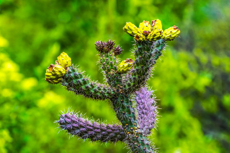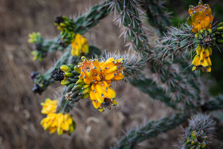 Yellow Blossoms Cane Cholla Cactus Walking Stick Cholla Blooming Macro Cylindropuntia imbricata Botanical Park Albuquerque New Mexico