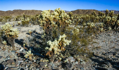 nature background. cholla cactus oasis in Joshua Tree National Park dessert.