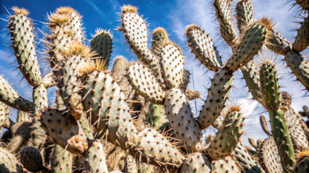 A cluster of green cacti with sharp spines is positioned against a clear blue sky highlighting their resilience and beauty in nature.