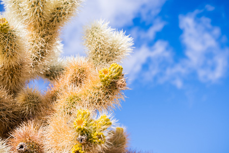 Close up of Teddybear Cholla (Cylindropuntia bigelovii), Cholla Cactus Garden, Joshua Tree National Park, south California; blue sky background