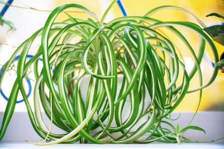 Closeup of green ribbons of chlorophytum comosum plant, air purifying plant