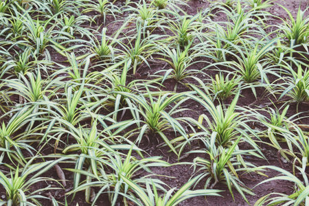 Pineapple plantation in the morning, close up of green leaves