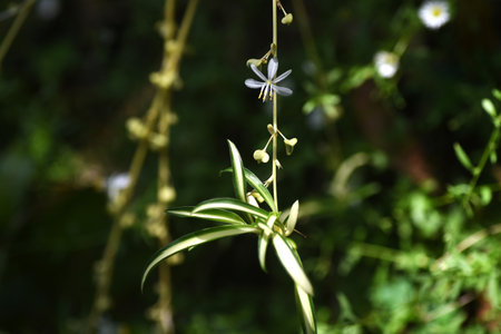Spider plant ( Chlorophytum comosum ) flowers. Asparagaceae evergreen perennial plants. Long slender stems and white flowers bloom from spring to autumn.