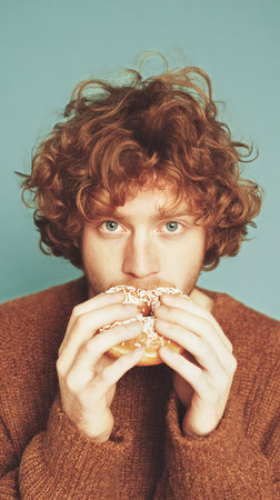 A young man with curly hair holds a donut topped with colorful sprinkles close to his face. He wears a warm sweater and looks directly at the camera, highlighting the treat.