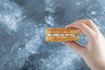 Jumping clockwork joke jaw with fangs in female hand on blue background.