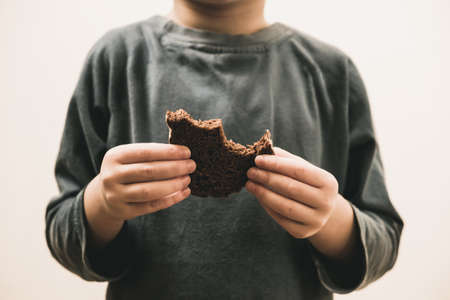 Child beggar eating cheap dirty bread. Poor children and people donations Volunteers Concept.