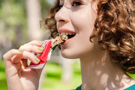 Close up view of beautiful happy redhead woman wearing green t-shirt standing on city park, outdoors biting protein or energy bar. healthy lifestyle. healthy eating.