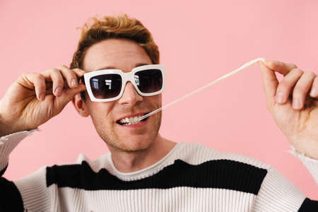 Ginger young man wearing sunglasses stretching bubblegum isolated over pink wall