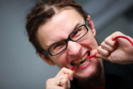 Brunette in white shirt is standing at wall and posing. He is holding loup in hand and showing his teeth on camera. Guy has big teeth. Isolated on striped and blue background.