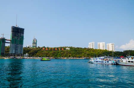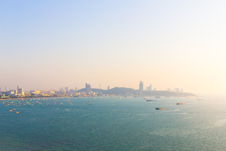 The sea where many boats are moored, with Pattaya City, the popular tourist attraction of Chonburi in the background.
