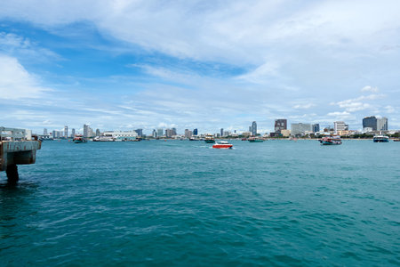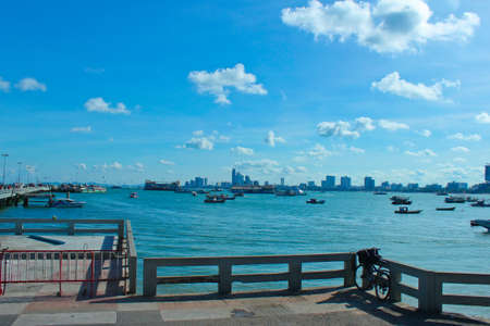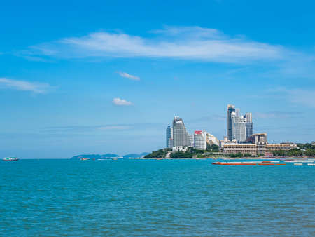 Beautiful tropical beach sea ocean bay around white cloud blue sky and architecture building in Pattaya city Thailand