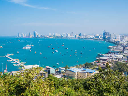 Beautiful architecture around Pattaya city skyline with Sea and Ocean bay in Thailand - Boost up color Processing