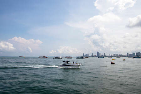 Landscape of Pattaya Bay and Pattaya city during the daytime with speedboat tour boats moored in the bay.