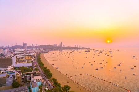Beautiful tropical beach sea ocean bay with architecture building and ship around pattaya city Thailand