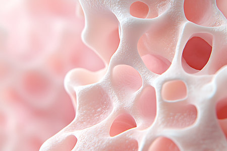 Osteoporotic trabecular bone, 3D illustration showing fewer and thinner trabeculae in bone with osteoporosis